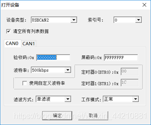 点击启动,选择USBCAN连接或者USBCAN2连接,索引号为0,波特率设为500kbps。