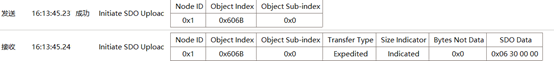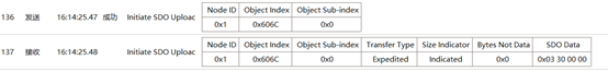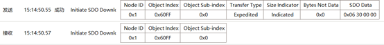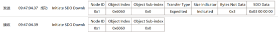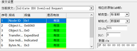 用SDO界面设置驱动器的工作模式和运行参数。点击数据发送按钮,选择Initiate SDO Download Request报文,依次填入:索引号为0x6060、子索引为0x0、数据类型为一个字节、数据为0x03,点击立即发送,如下图所示,发送之后SDO会有应答。