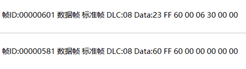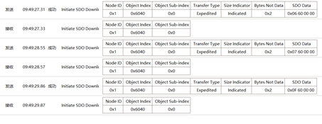 连续设置伺服驱动器的状态,索引号为0x6040、子索引为0x0、数据类型为两个字节、数据为0x6006,点击发送。设置索引号为0x6040、子索引为0x0、数据类型为两个字节、数据为0x6007,点击发送。设置索引号为0x6040、子索引为0x0、数据类型为两个字节、数据为0x600A,点击发送。如下图所示,发送之后SDO会有应答。此时伺服器已经启动。