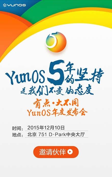 关注国产操作系统的读者朋友们应该对 YunOS 不陌生,这是一款阿里巴巴自主研发的智能操作系统,到目前为止已经有了 5 年的历史。现在,它的新版就要来了。 今天,YunOS 官方微博宣布,将于12月10日在北京召开YunOS年度发布会,发布会的主题为“有点大不同”。 有消息称,这次发布会上,YunOS 的新版本将正式发布,而且很有可能会跳过 4.0 版(目前的版本号是 3.x),直接以 5.0 来命名新版。 至于新版到底有什么特色暂时还不清楚,但相信经过了一年的积累之后,它的表现肯定要比目前的3.0版更好一些,而且不仅限于手机,包括平板、电视盒子、手表、汽车等等都能采用,并不逊色于Android。 此外,YunOS 的一大优势就是可以兼容 Android 应用,相信在5.0版上这一优势也会继续保留下去。