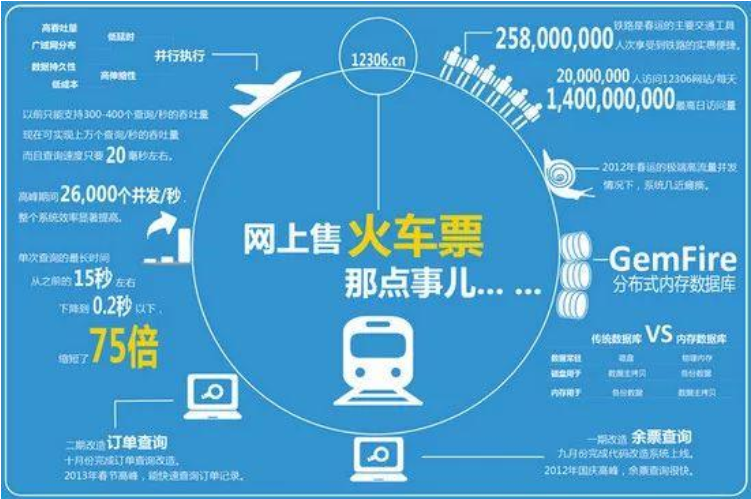 一次是在上线后的一年内选择与美国科技公司Pivotal(中译“毕威拓”)合作,引入后者的GemFire分布式内存计算平台技术率先对12306的余票查询系统进行改造。“分布式数据处理”和“集中式数据处理”概念相对,在解决12306的票务问题上分布式计算更有优势(不懂两者区别的朋友请自行搜索)。这次技术改造效果明显,让12306暂时舒了一口气。