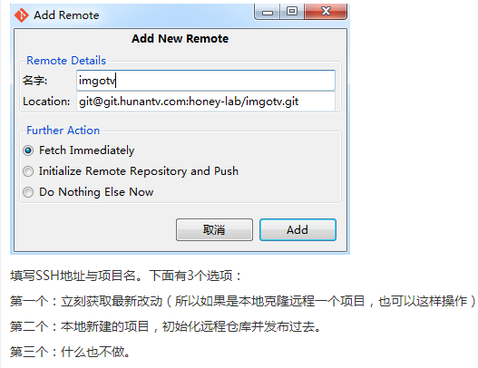 设置和远程仓库关联(如果从项目根目录进入,则自动关联,不用设置) 如果需要设置,选择