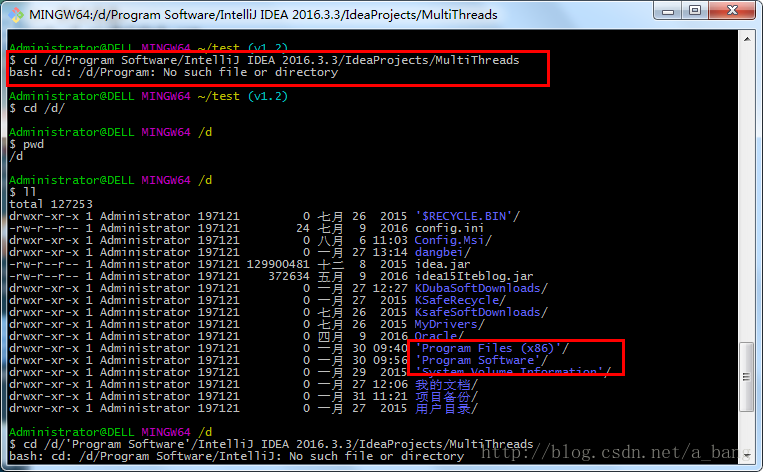 提示找不到目录:/d/Program。进入d盘查看,发现如果目录名中间有空格的时候,bash默认是要加单引号的