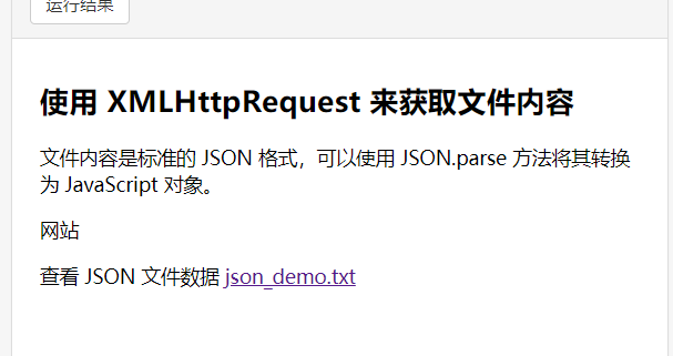 <!DOCTYPE html> <html> <head> <meta charset="utf-8"> <title>菜鸟教程(runoob.com)</title> </head> <body> <h2>使用 XMLHttpRequest 来获取文件内容</h2> <p>文件内容是标准的 JSON 格式,可以使用 JSON.parse 方法将其转换为 JavaScript 对象。</p> <p id="demo"></p> <script> var xmlhttp = new XMLHttpRequest(); xmlhttp.onreadystatechange = function() { if (this.readyState == 4 && this.status == 200) { myObj = JSON.parse(this.responseText); document.getElementById("demo").innerHTML = myObj.name; } }; xmlhttp.open("GET", "/try/ajax/json_demo.txt", true); xmlhttp.send(); </script> <p>查看 JSON 文件数据 <a href="/try/ajax/json_demo.txt" target="_blank">json_demo.txt</a></p> </body> </html>