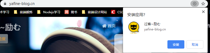 前面的步骤操作没错,配置也没问题,则在本地运行试,浏览器地址栏中会出现一个类似 ➕ 加号的图标,点击它会出现一个弹出框,就说明配置成功,当然你可以选择安装,安装过后桌面会出现一个图标,点击就可以访问,但是如果你本地服务关闭的话,再点击这个图标,有些页面可以访问,但有些页面访问不了。如果需要它都能够全部访问的话,你需要开启本地服务,也就是hexo s