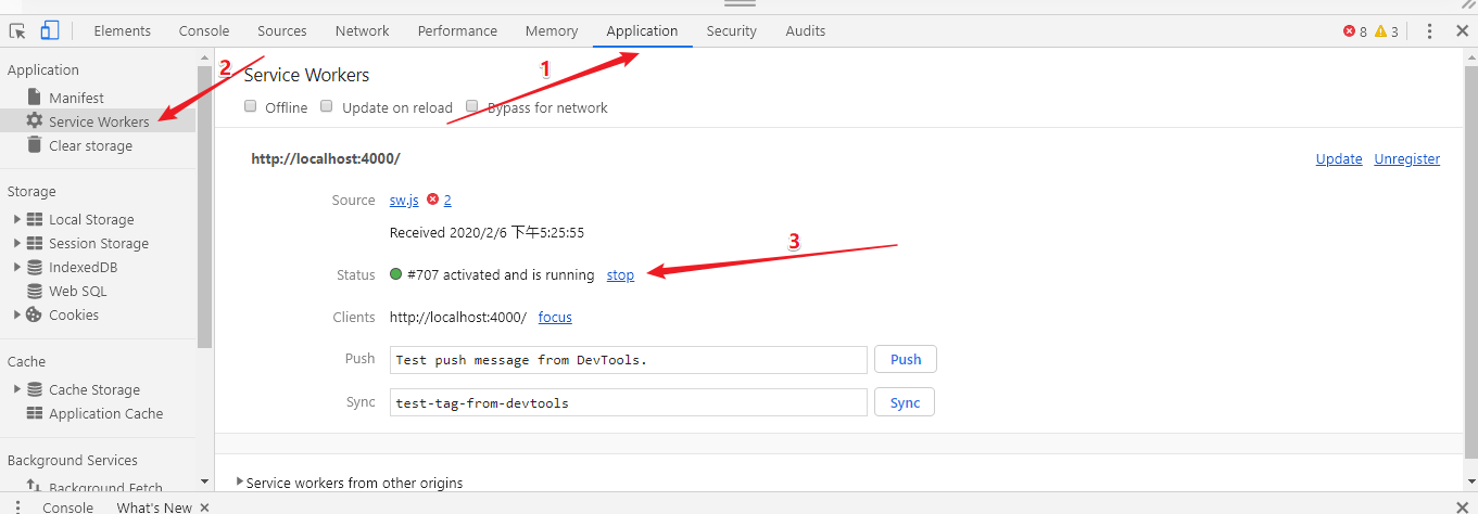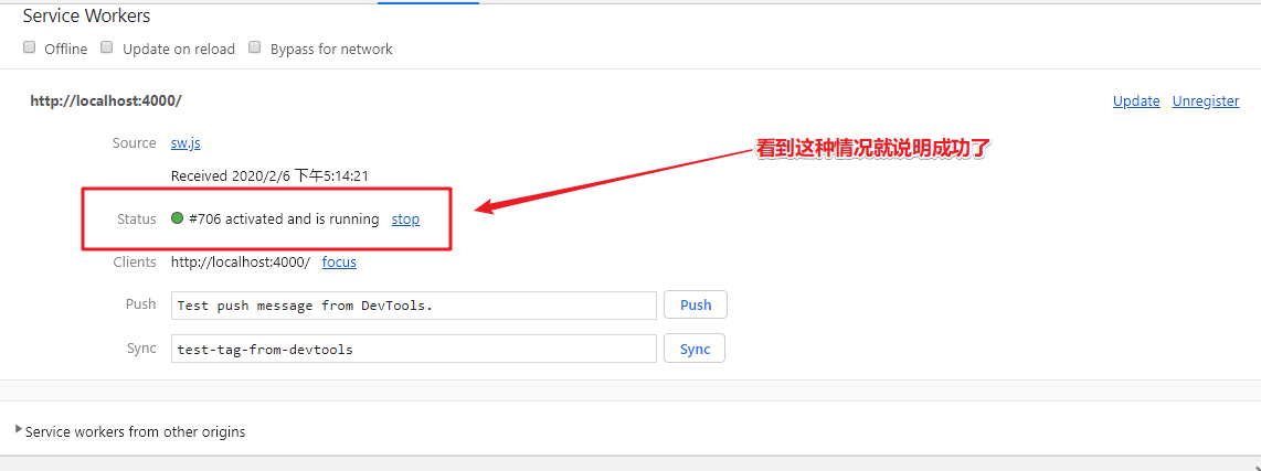 按**F12或者Ctrl + Shift + I或者直接鼠标右键弹出的菜单中,有个检查,鼠标点击,就可以进入开发者调试模式,然后选择Application—>Service Workers**,查看是否成功?