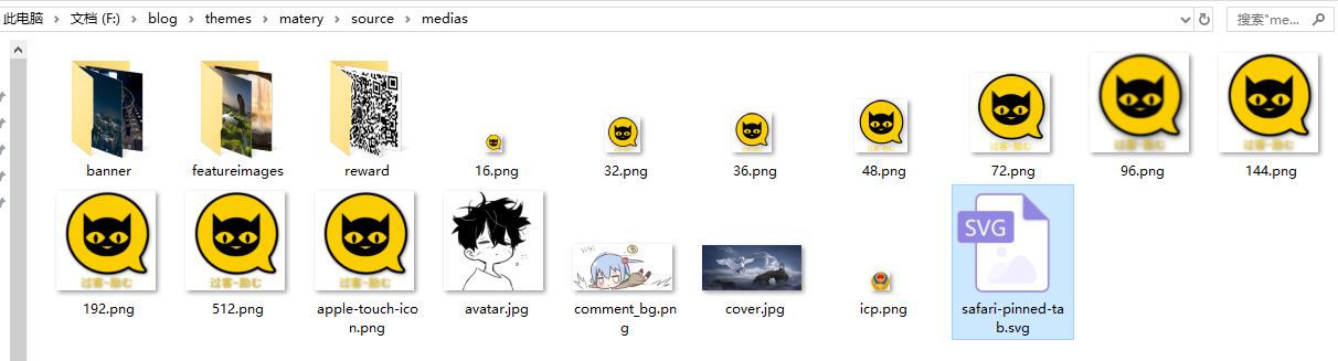 将准备好的Logo图片素材放到配置文件所指向的对应的文件夹位置,我放在了F:\blog\themes\matery\source\medias(这是我的路径),修改配置文件,与其一一对应,切不可写错。