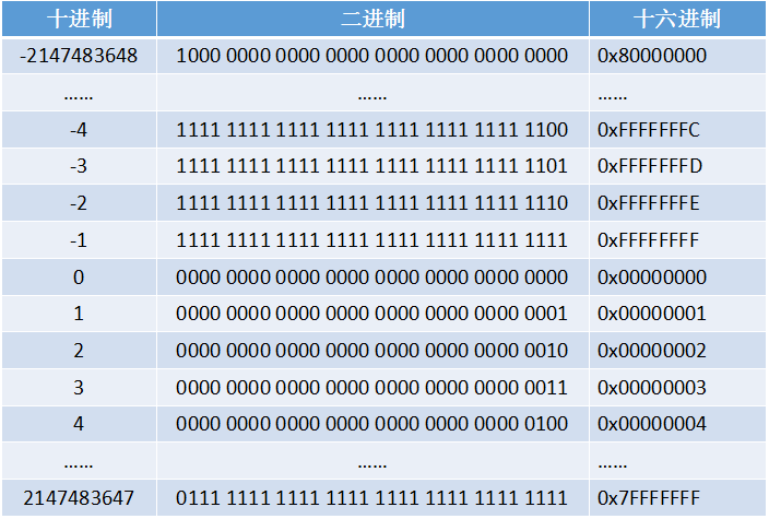 递减:二进制数右端每次减1(逢0借1),一直到31个非符号位的1全部变成0,得到最小的负整数为-2147483648。