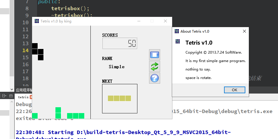 首先的话整个游戏都是用c++写的,比较简单,当时的想法是先做出来看看,所以很多地方不是很完善,只能看看。qt是5.0以上的版本 截图: