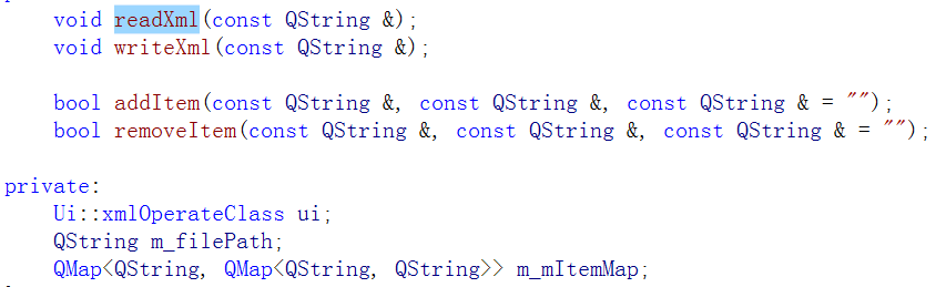 如图2所示,是我们xml文件操作类的几个重要接口和成员,前边4个公有接口分别对应。读、写、新增和删除;成员变量m_filePath表示加载的xml文件路径,m_mItemMap表示2级的ini文件结构