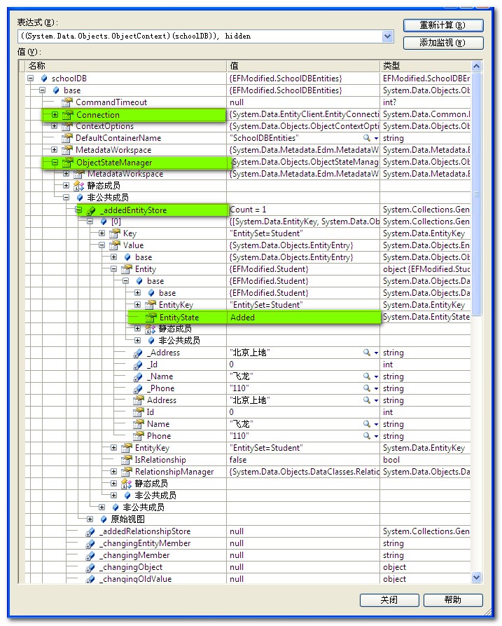 就是简单的网数据库中添加一条数据。我们在上面代码红色背景地方加上断点【schoolDB是EF自动帮我们生成的继承自ObjectContext的上下文】并对schoolDB进行快速监视。截图如下: