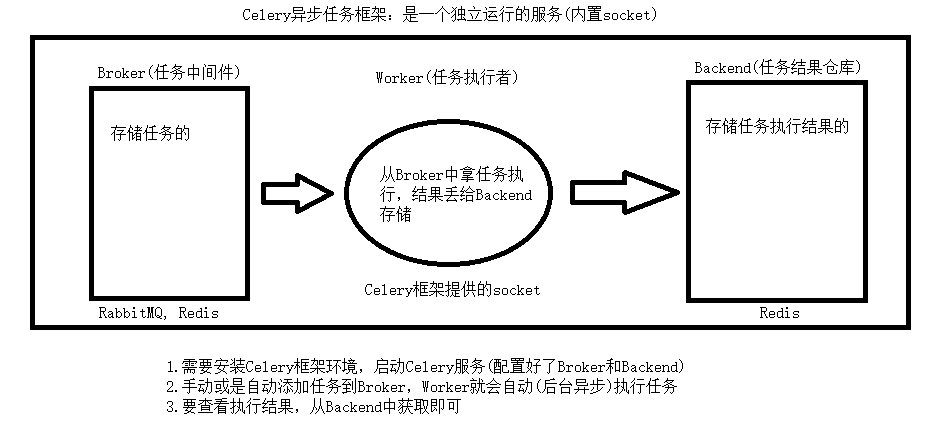 注:会有两个服务同时运行,一个是项目服务,一个是celery服务,项目服务将需要异步处理的任务交给celery服务,celery就会在需要时异步完成项目的需求