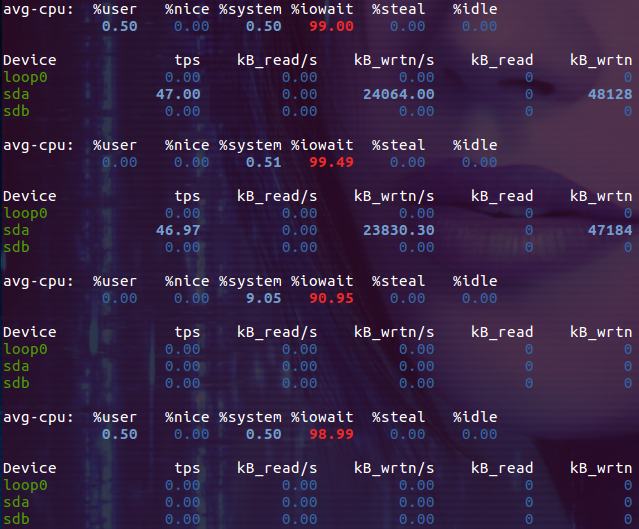 下面是 iostat 2 的输出(同样是高 iowait,瓶颈是写磁盘):