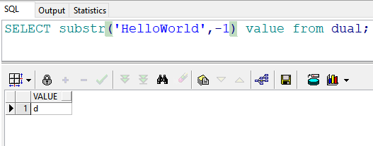 7、select substr('HelloWorld',-1,3) value from dual; //返回结果:d (从后面倒数第一位开始往后取1个字符,而不是3个。原因:下面红色 第三个注解)