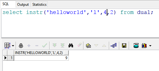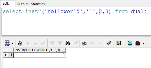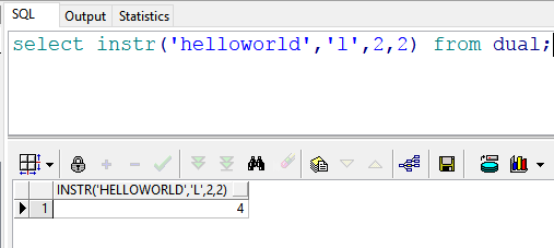 2 select instr('helloworld','l',3,2) from dual; --返回结果:4 也就是说:在"helloworld"的第3(l)号位置开始,查找第二次出现的“l”的位置
