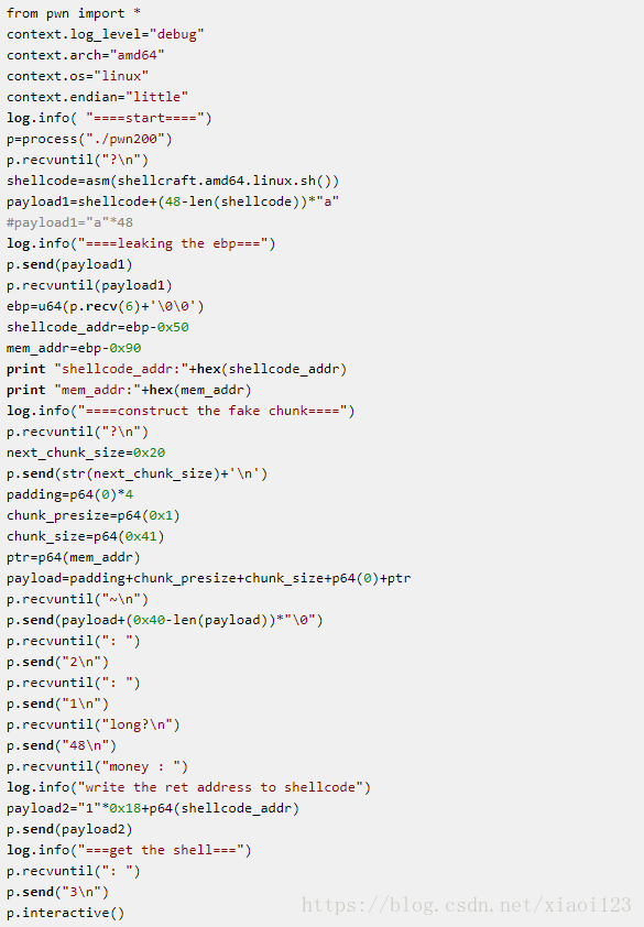 将局部分量money伪造成一个chunk,构造好大小并且使得大小把返回地址包括在内,把ptr的值溢出覆盖为构造的chunk的地址,这个地址可以通过泄露的ebp计算出来