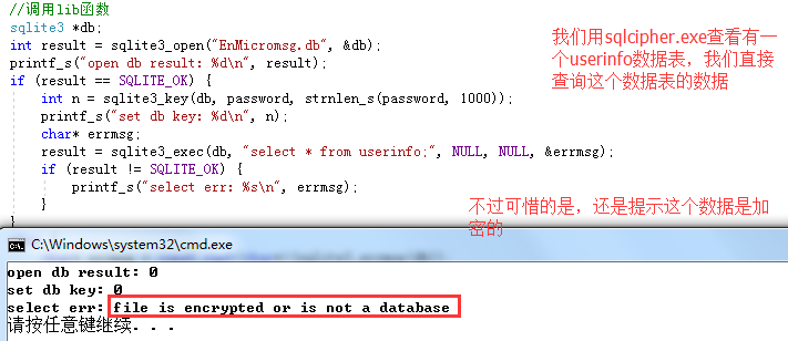 那么不多说了,先来解决第一件事就是利用之前的文章说的SQLCipher代码来解密微信数据库看看能否成功,代码修改很简单,直接把我们计算的密码替换一下,然后把微信的加密数据库EnMicroMsg.db放到工程目录下,运行即可: