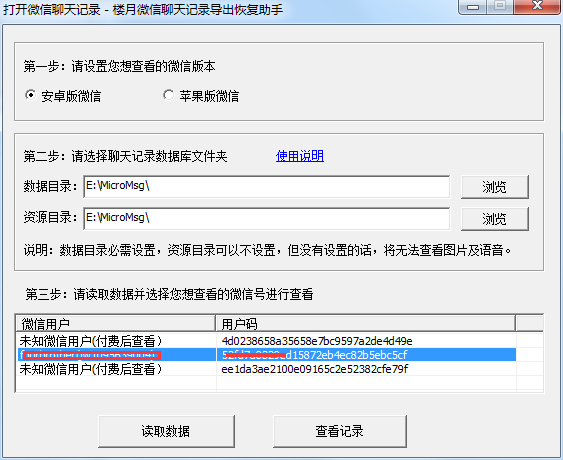 只需要选择微信的数据库目录MicroMsg即可,就可以识别出来用户,然后点击指定用户就可以查看对应的数据了,所以他这么一说我倒是有点怀疑我的方法了?因为毕竟他用这个工具解密是没有问题的。所以我就用这个工具查看了一下的确没问题,那么为什么这个工具可以解密成功呢?所以我就想探究这个工具的原理,但是我不会PC端的软件逆向,但是我们可以借助强大的逻辑排除法定位,你看这个工具是需要选择微信数据库目录的,也就是这样的格式: