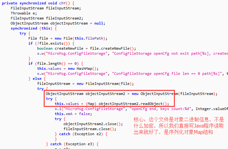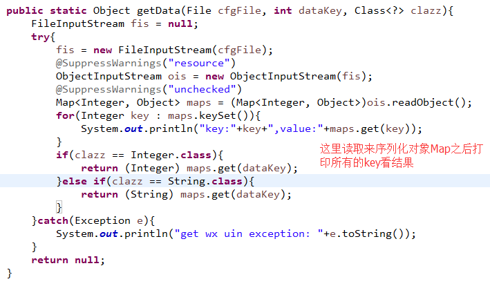 到这里就看明白了,原来不是什么加密操作,而是序列化对象到文件中,那么想看这个文件的原始内容就简单了,我们去写一个Java程序把文件中的内容读取出来是Map结果,然后把所有的key和value打印看看结果: