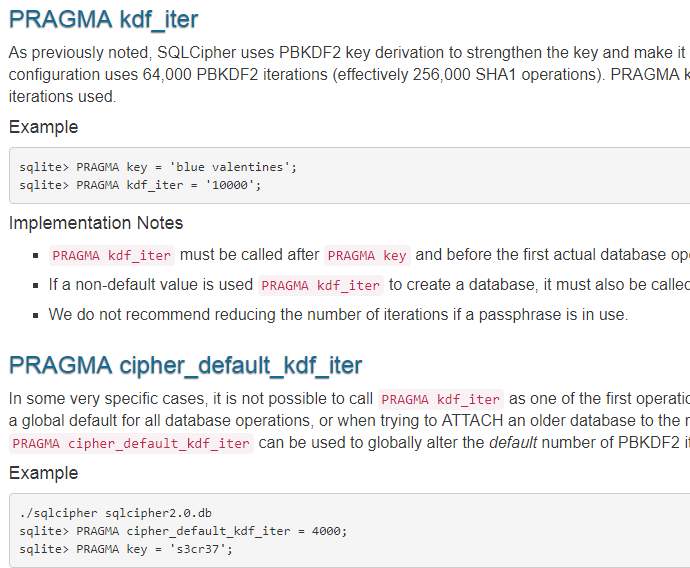 可惜的是运行代码提示数据库加密了,也就是我们解密数据库失败了,但是我们用sqlcipher.exe工具查看都没有问题,所以这里的密码是没有问题的,但是哪里出问题呢?代码也是没问题,因为我们之前写的demo都没有问题,所以就怀疑微信的数据库加密做了一些其他设置,我们可能还需要设置一些东西,就跑去SQLCipher官网查看api: