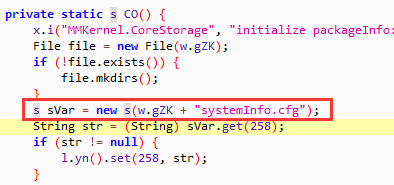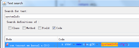 我就好奇了,我们在之前的文章中了解到用忽的UIN是存储在xml中的,但是你看这个工具只要导入这个目录就可以解密,也就是说他能够拿到设备imei和uin值,所以我就怀疑他读取这个目录下的几个文件获取的,那么就一个一个排除,首先通过肉眼判断哪些文件肯定不是的,最后发现就这几个cfg文件打开是二进制文件,所以怀疑对象就在这几个文件了,因为文件不多,我们可以这么排除,就是通过逐一修改文件名,然后在用那个工具解密,如果提示错误了,那么就表示这个文件是关键的,通过最后排查,有两个文件不能修改,也就是上图中文件名后面没有11的两个,一个是systemInfo.cfg和CompatibleInfo.cfg了。那么这个文件是二进制文件,怎么解密呢?这个就简单了,直接用Jadx全局搜这两个文件: