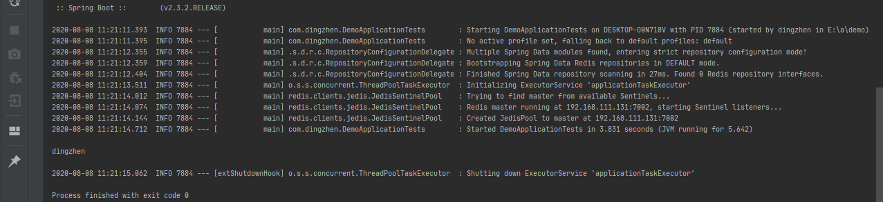 2020-08-08 11:21:13.511 INFO 7884 --- [ main] o.s.s.concurrent.ThreadPoolTaskExecutor : Initializing ExecutorService 'applicationTaskExecutor' 2020-08-08 11:21:14.012 INFO 7884 --- [ main] redis.clients.jedis.JedisSentinelPool : Trying to find master from available Sentinels... 2020-08-08 11:21:14.074 INFO 7884 --- [ main] redis.clients.jedis.JedisSentinelPool : Redis master running at 192.168.111.131:7002, starting Sentinel listeners... 2020-08-08 11:21:14.144 INFO 7884 --- [ main] redis.clients.jedis.JedisSentinelPool : Created JedisPool to master at 192.168.111.131:7002 2020-08-08 11:21:14.712 INFO 7884 --- [ main] com.dingzhen.DemoApplicationTests : Started DemoApplicationTests in 3.831 seconds (JVM running for 5.642)
