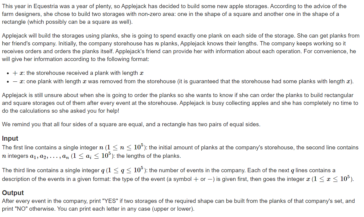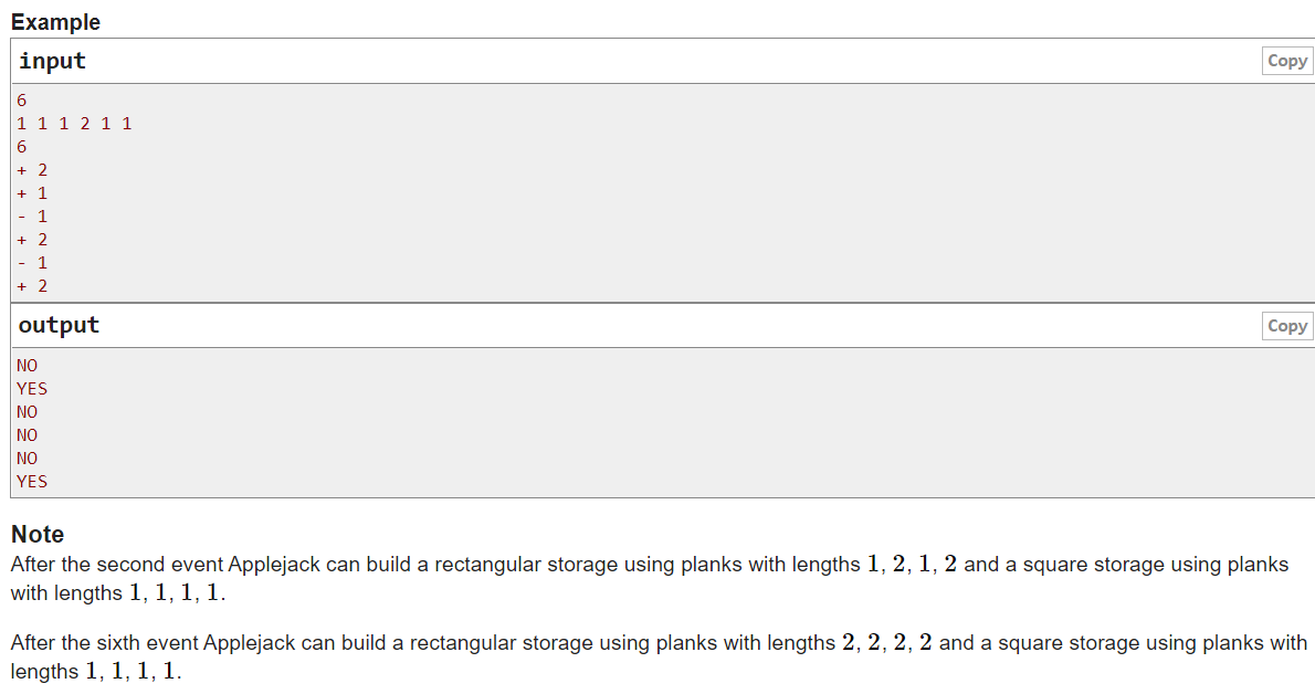 有 n 条边,给出对应的长度,有 m 次询问,每次会 ‘+’:添加一根木棒,或 ‘-’:减少一根木棒,问是否可以组成一个正方形和一个长方形,这两个四边形不可以重合,减少时,保证一定拥有这种长度的木棒