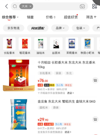 我们搜索了一下京东,看大米价格如何,情况如下: