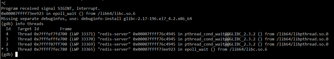 然后按 CTRL+C 将 GDB 中断下来,输入 info threads 查看当前程序的所有线程: