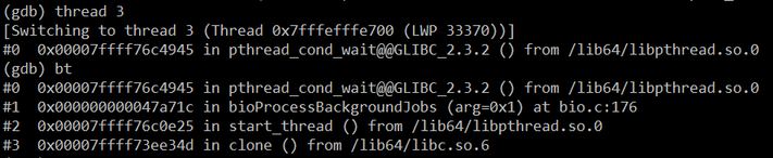 接着挨个使用 thread + 线程编号 和 bt 命令去查看每个线程的上下文调用堆栈: