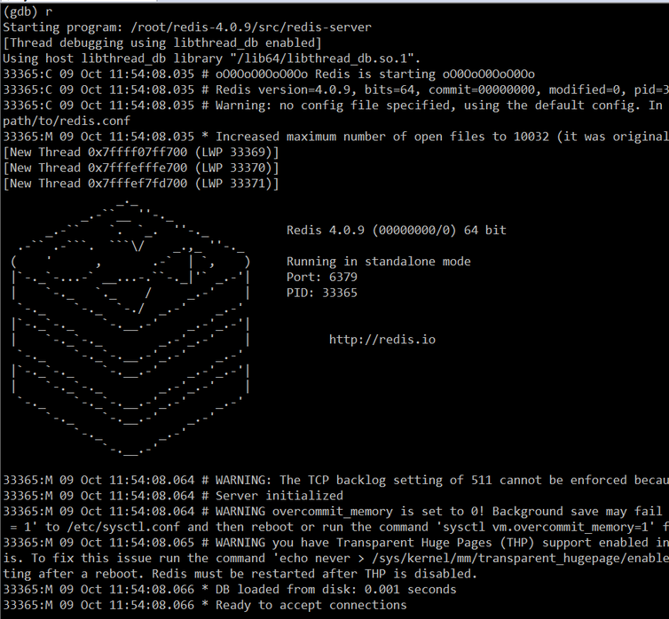在大致了解了 Redis 有哪些代码模块以后,我们把代码拷贝到 Linux 平台,然后编译并使用 GDB 调试器跑起来。如下图所示: