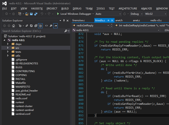 这里我以学习 Redis 为例。将 Redis 源码从官网下载下来以后,使用喜欢的代码阅读器进行管理。我这里使用的是 Visual Studio,如下图所示: