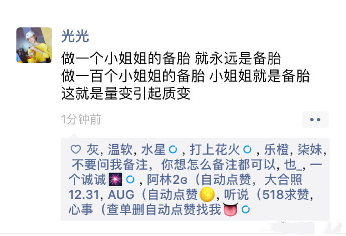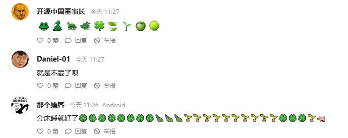 @ clouddyy (这玩意他光说有嘛用 要不别给人心理压力 别催就完事了。)@ 机器人-1(哈哈哈哈 反正都花了)@ nnnm (我现在也觉得写乱弹挺重要的,每天的时间跟你们沟通很有意思。)@ 凉小生(+1)@ 穿山甲66 (对……舍得给孩子花钱买这个,差他们那点钱么)@ OSC最端得住 (我也像这么说呢)@ meinkampf (同意 真司马)@ 罗马的王 (对……所以怎么高兴怎么来就是了)@ 落落酱 (哈哈哈哈哈哈哈哈哈哈哈哈哈 骑车子拿快递……笑死了)@ 云朵在睡觉 (哈哈哈 没有好吃的了 有的人就退出了 哈哈哈 )@ TheSummer (对呀……你喜欢的人恰好喜欢你是最幸福的了。)@ 曾经蜡笔没有小新 (同意 同意)@我本善良i(对对对)@开源首席骨科大夫 (早)