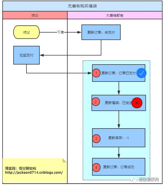 悟空:也就是说第一步顶单状态从未支付到订单成功已经执行成功了,但是第二步更新福袋的时候失败了,没有自动将第一步订单的状态给改回去?