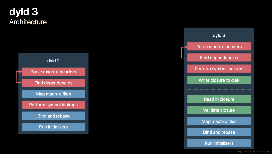上面的所有过程都发生在 App 启动时,包含了大量的计算和I/O,所以苹果开发团队为了加快启动速度,在 WWDC2017 - 413 - App Startup Time: Past, Present, and Future[4] 上正式提出了 dyld3。