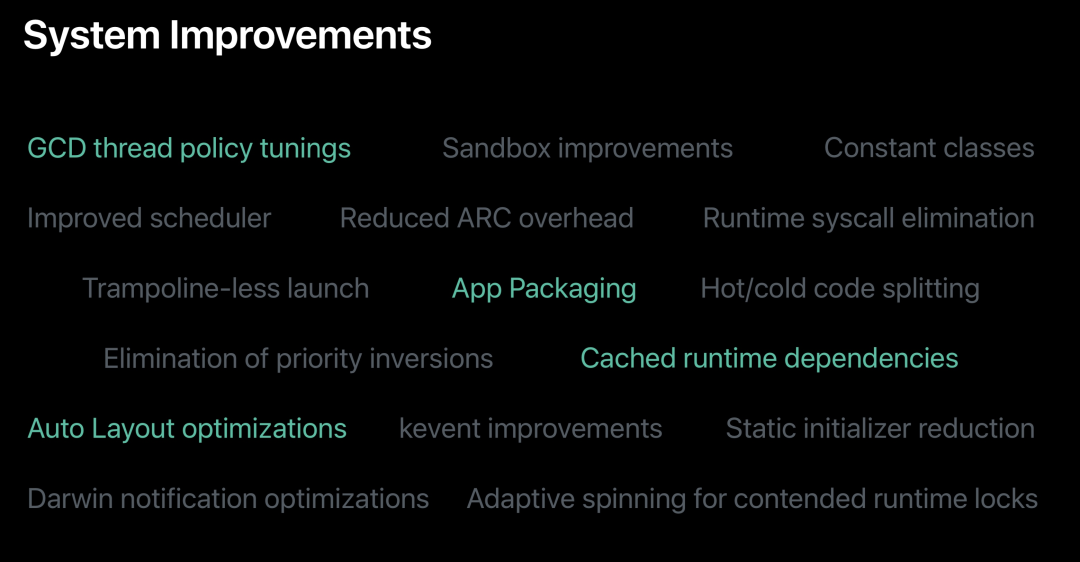 去年苹果做了很多优化,下面这几个高亮的是和启动速度有关的优化