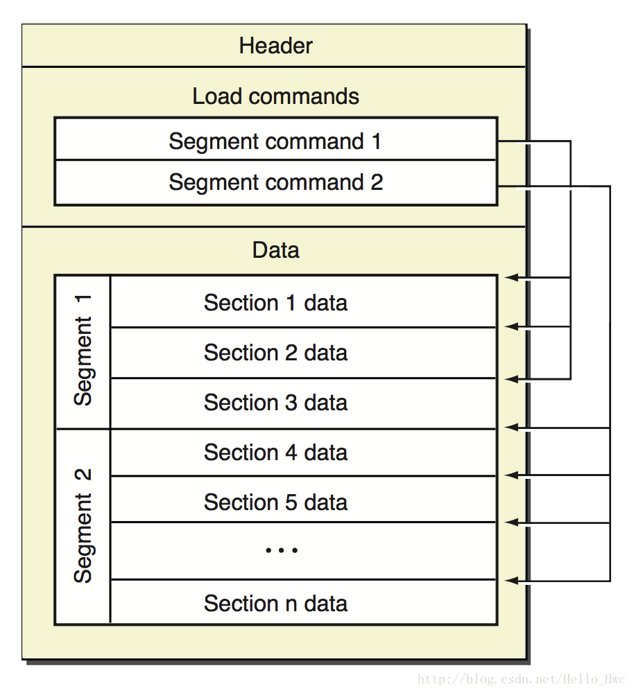 Mach-O 的基本结构如下图所示,分为三个部分: