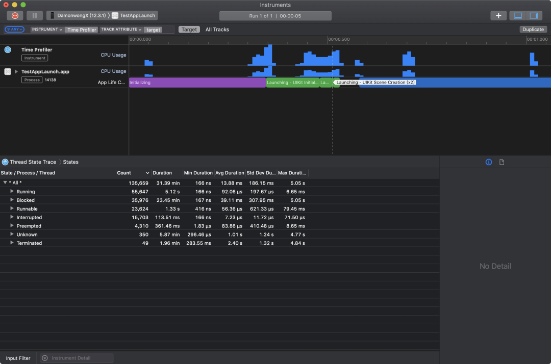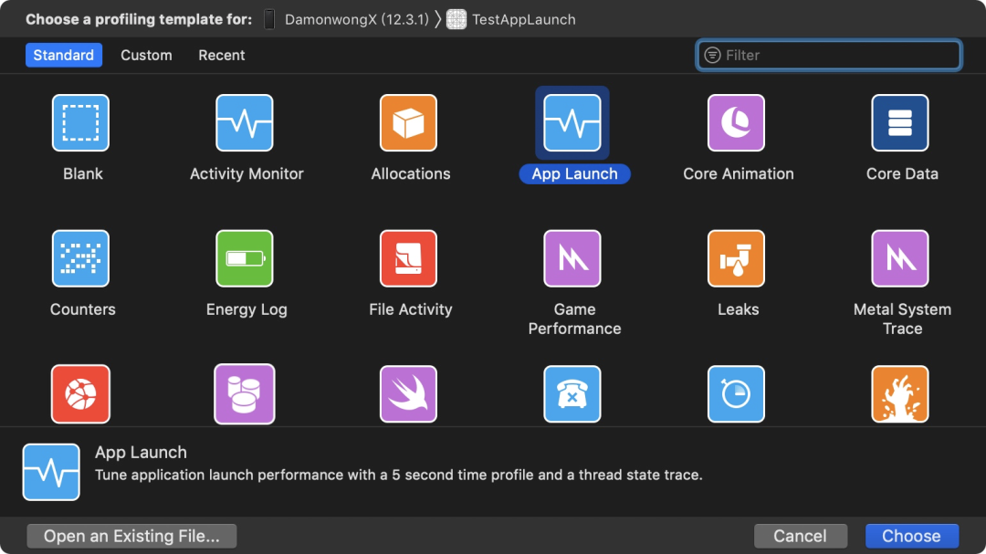当知道如何优化之后,我们需要针对我们的启动过程进行分析。Xcode 11 的 Instruments 为此新增了一个 App launch 模板,让开发者可以更好的分析自己 App 的启动速度。