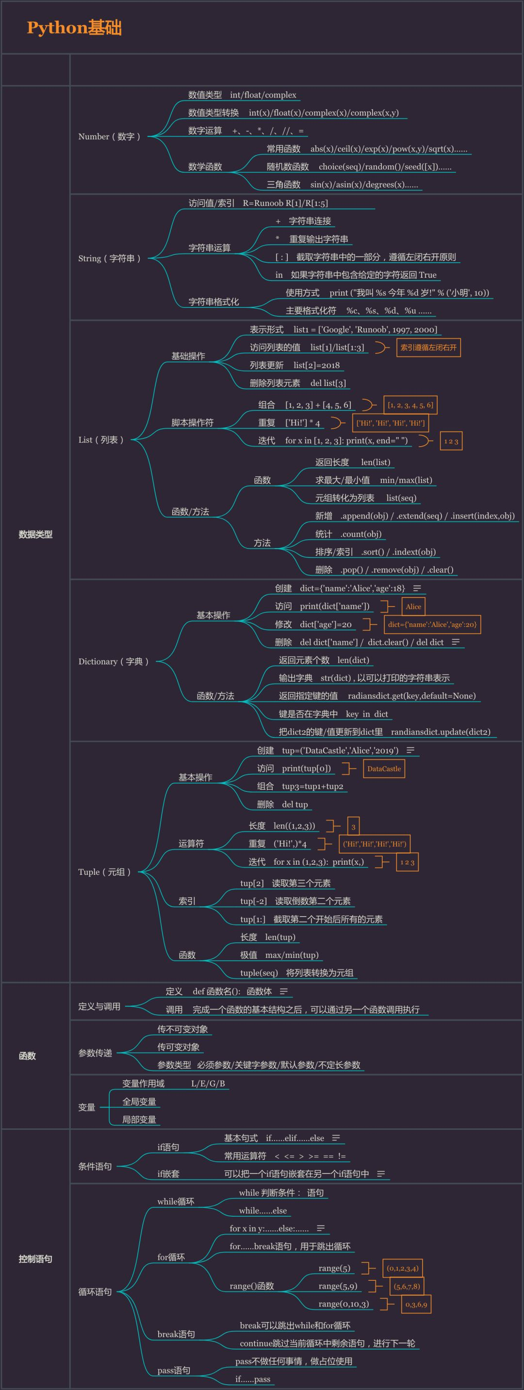 ·基本的数据类型:比如字符串、列表、字典、元组,不同的数据类型如何创建、进行增、删、改等操作,以及其中常用的函数及方法;