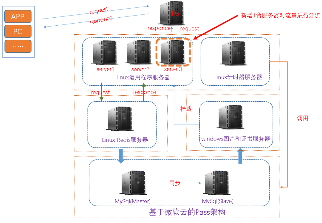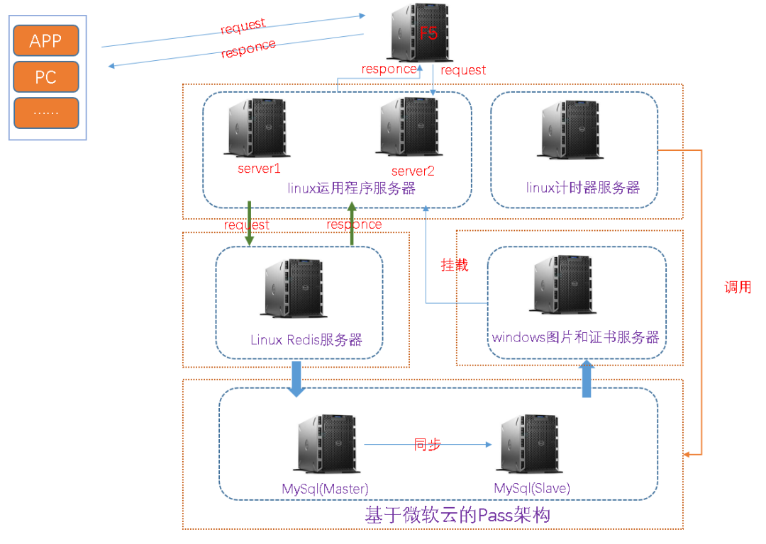 (2)服务器类别:1台负载均衡服务器(F5),3台运用程序服务器,1台计时器服务器,1台redis服务器,1台图片服服务器和1台基于Pass架构的Mysql主从服务器(微软云)