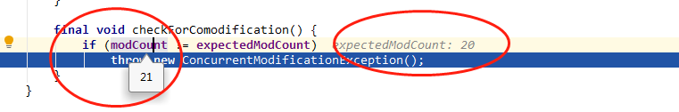 断点可以看到,remove操作后,modeCount=21, 而expectedModCount=20 不相等,抛出异常.
