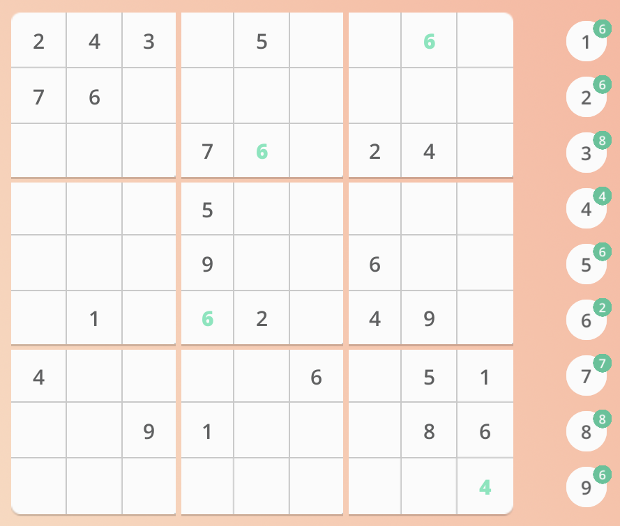 (a). 首先需要找到表格上未填入的数字每一种有多少个,找到剩余未填数目最少的那一个(如上图就是 6 ,它剩余 5 个是没有填的)