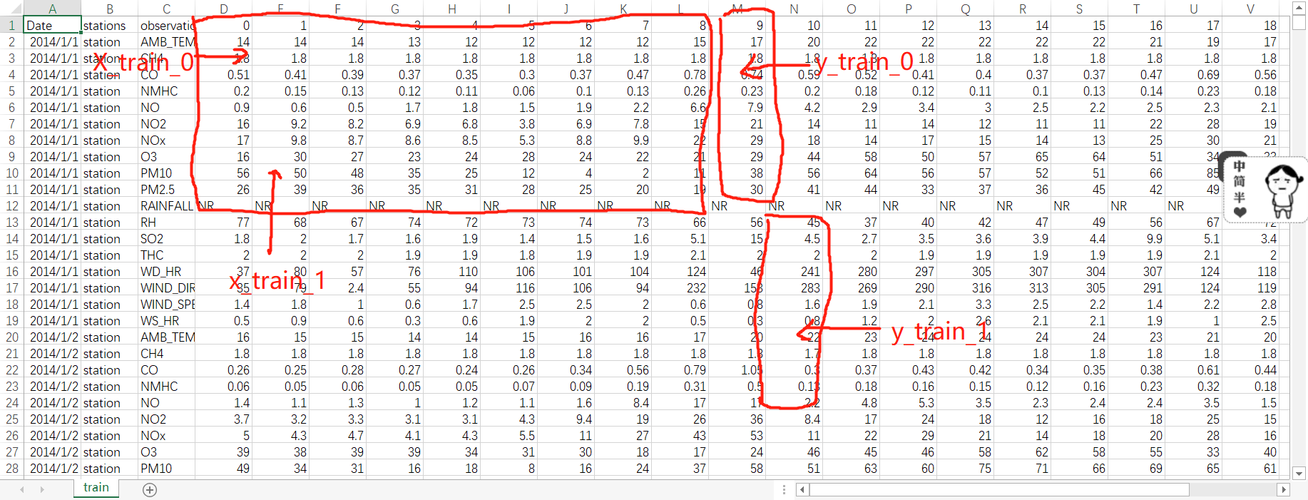 取出来,形成一个维度为(18,9)的数据帧,作为训练数据,将9时的PM2.5含量取出来,作为该训练数据对应的label;同理可取1到9时的数据作为训练用的数据帧,10时的PM2.5含量作为label......以此