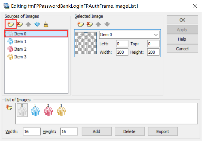 回过头看看,刚才添加Item 时,所在的区域是叫Sources Of Images,这里正是和VCL使用差别的地方,如果想和VCL的TImageList使用方法接近,则可以直接在下面的 List Of Images区域里添加,在过程中会自动添加到Sources Of Images区域。