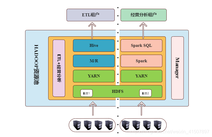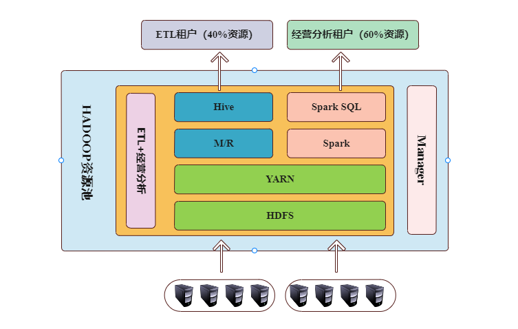 ETL和经营分析合并部署为一个Hadoop集群,并为数据处理和数据分析分别设置不同的租户,通过对两类租户设置不同的资源上限,实现资源隔离,做到互不影响。