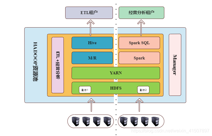 ETL和经营分析合并部署为一个Hadoop集群,并为数据处理和数据分析分别设置不同的Hive、Spark等组件实例。实例可以指定具体部署的物理机或者容器,通过实例做到物理隔离,即在YARN之上的计算资源完全隔离,做到互不影响。