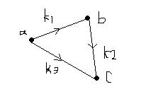 比如给出三个不等式,b-a<=k1,c-b<=k2,c-a<=k3,求出c-a的最大值,我们可以把a,b,c转换成三个点,k1,k2,k3是边上的权,如图