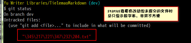 status查看有改动但未提交的文件时总只显示数字串,显示不出中文文件名,非常不方便。如下图: