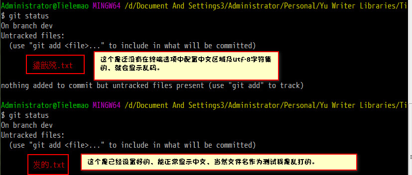 要注意的是,这样设置后,你的git bash终端也要设置成中文和utf-8编码。才能正确显示中文,例如对比如下: