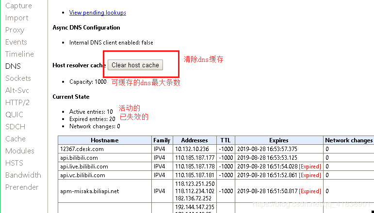 里面记录了浏览器的dns缓存,点击“clear host cache” 可以清除浏览器dns缓存。